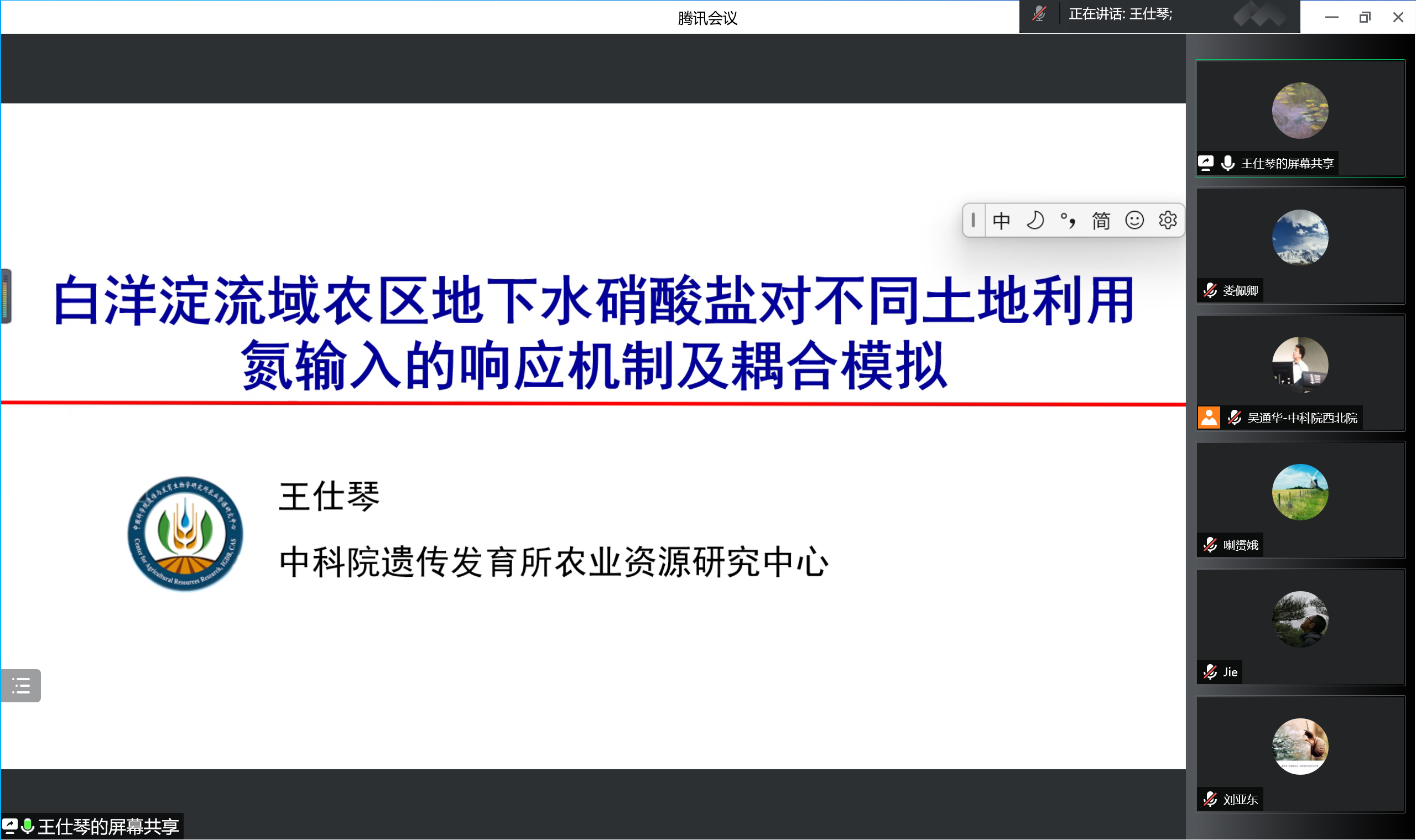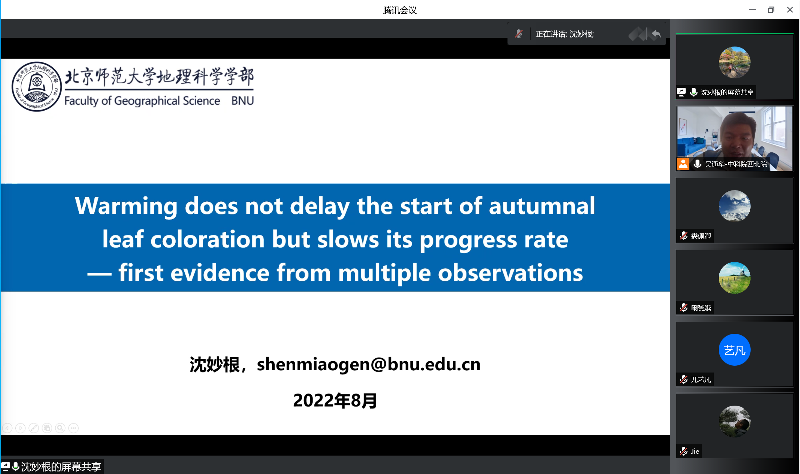 2022年8月22日北京师范大学沈妙根教授和中国科学院遗传发育所农业资源研究中心王仕琴研究员应邀与我站科研人员进行了线上学术交流。沈妙根教授和王仕琴研究员分别做了题为“Warming does not delay the start of autumnal leaf coloration but slows its progress rate — first evidence from multiple observations”和“白洋淀流域农区地下水硝酸盐对不同土地利用氮输入的响应机制及耦合模拟”的学术报告。
