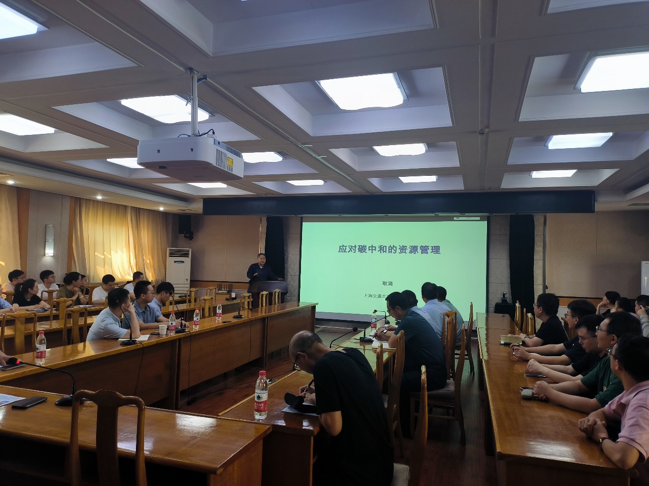 耿涌院长首先以近年来频发的极端高温和洪涝灾害事件为切入点,介绍了当前全球和区域所面临的重大环境问题,以及人类为应对气候变化作出的努力,并回顾了三十余年来国际气候变化谈判的艰难历程以及他亲身经历参与IPCC第四次、第五次和第六次评估报告的编写情况。随后他介绍了全球主要国家的能源格局和发电量,以及碳排放的结构、历史与现状。他通过详实的数据和案例,分析了中国作为世界制造业第一大国,在能源结构、产业格局、资源禀赋予消耗、能源贸易战略、技术革命、管理革新等方面的现状和面临的基本问题,并以全球和中国对稀土资源的开采和新能源汽车产业的发展为例,系统阐述了关键矿产资源和新兴产业在国家战略层面的重要价值。最后,耿涌院长深入剖析了工业、矿产、能源、交通和电力等关键行业和领域的低碳发展和减排路径,为新时期中国如何更好地践行绿色发展新理念,以及如何按计划实现“碳中和”与“碳达峰”的战略目标,提出了明确的发展方向和建议。耿涌院长从资源管理和利用的角度深入浅出地为参会人员做了一次生动的国情教育和宣讲,为我国应对碳中和提供了新认识,为我站研究人员开展多学科交叉研究提供了新思路。