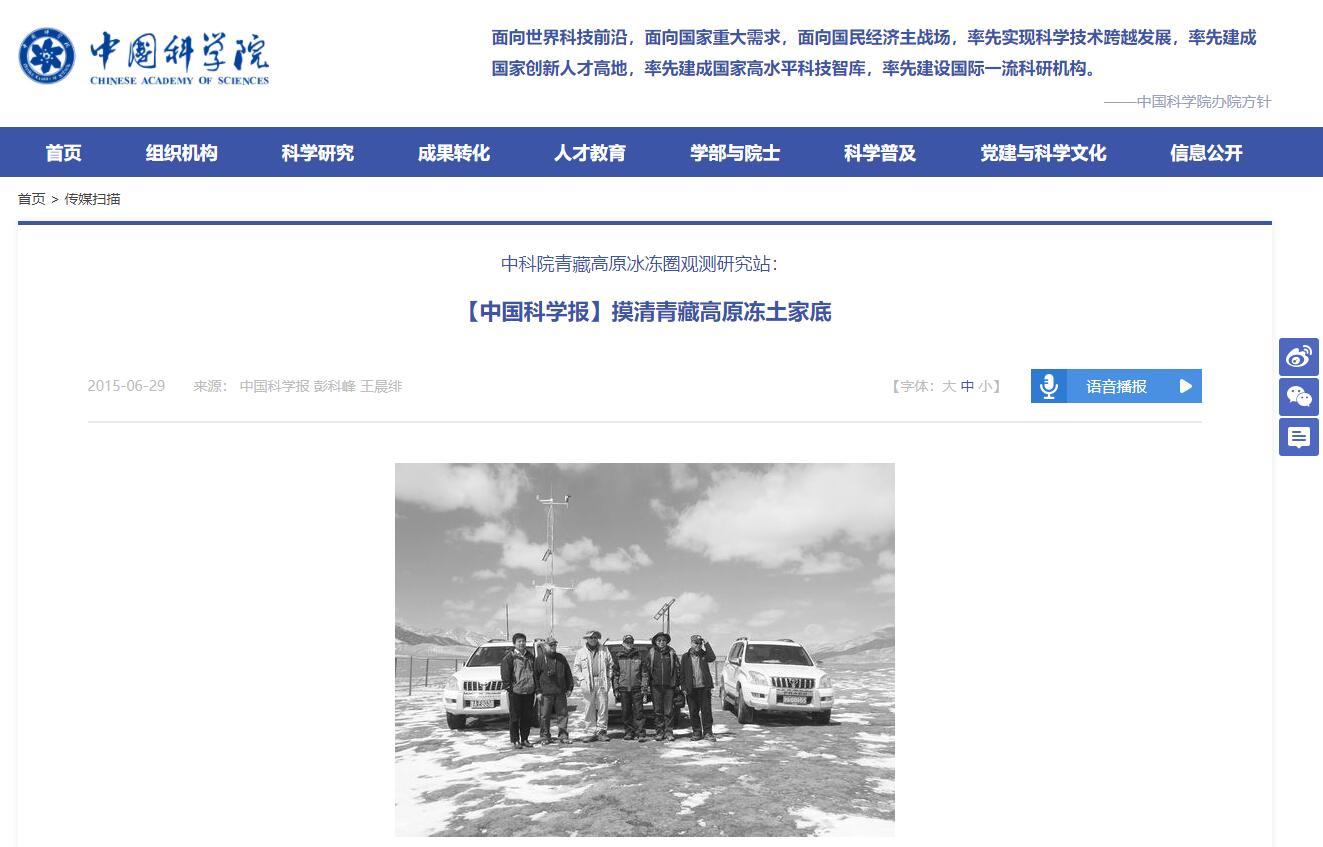 近日,中国科学报以“摸清青藏高原冻土家底”为题报道我站研究工作,之后多家门户网站进行了转载。详情点击:科学网(http://news.sciencenet.cn/htmlnews/2015/6/321655.shtm)中国科学院网(http://www.cas.cn/cm/201506/t20150629_4380670.shtml)搜狐网(http://mt.sohu.com/20150629/n415808452.shtml)和讯网(htt... 近日,中国科学报以“摸清青藏高原冻土家底”为题报道我站研究工作,之后多家门户网站进行了转载。详情点击:科学网(http://news.sciencenet.cn/htmlnews/2015/6/321655.shtm)中国科学院网(http://www.cas.cn/cm/201506/t20150629_4380670.shtml)搜狐网(http://mt.sohu.com/20150629/n415808452.shtml)和讯网(htt...