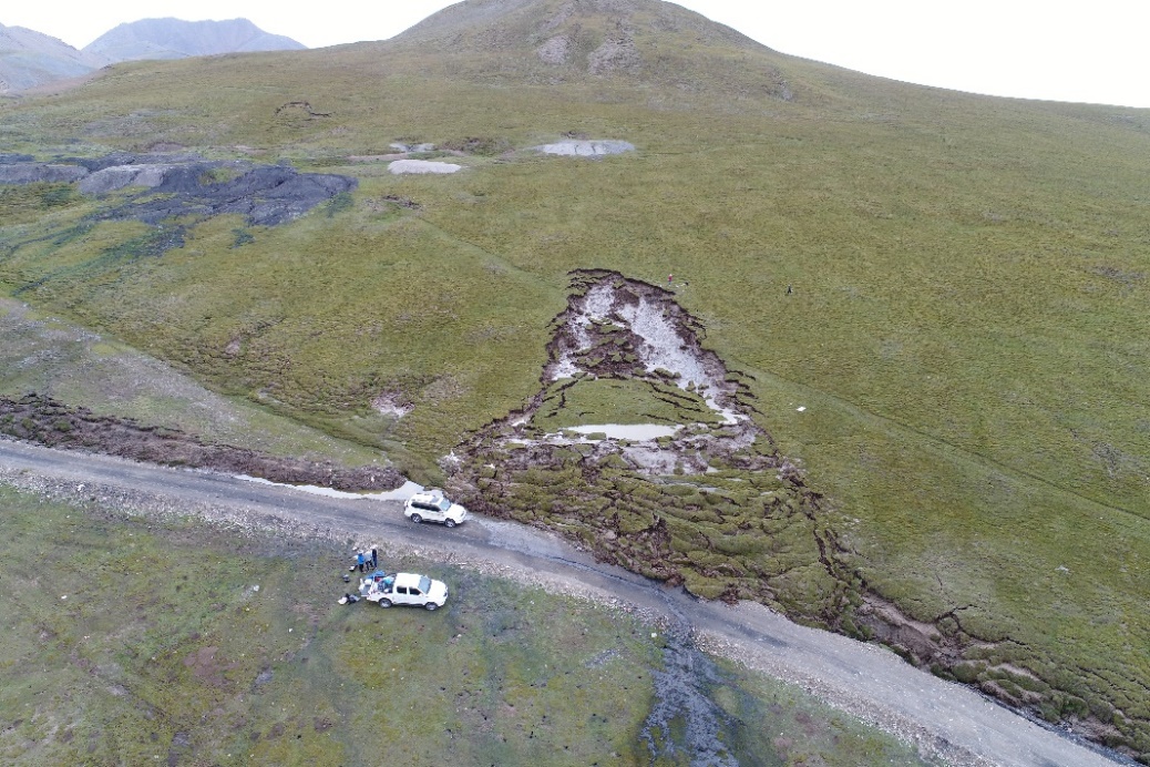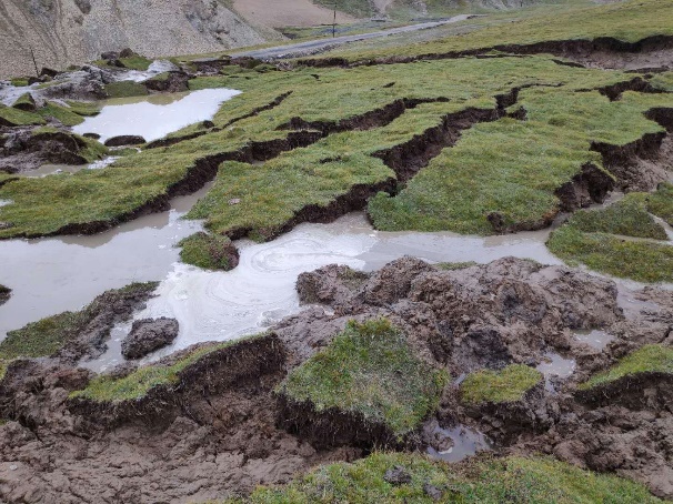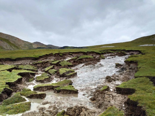 青海省兴海县温泉乡温泉村牧场2018年9月1日凌晨发生热融滑塌事件,滑塌体长度70余米,面积约2000m2。该次滑塌造成大面积的草场破坏,几乎阻断了通往温泉村的道路。