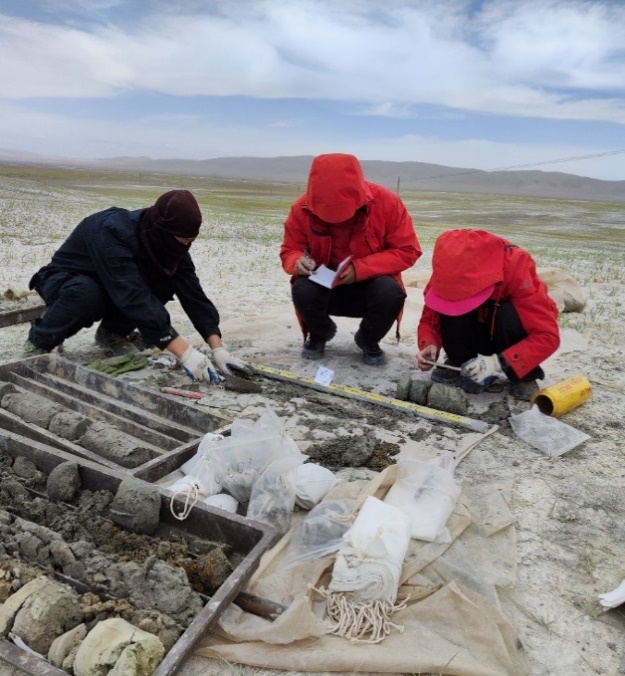 新疆阿尔金山国家级自然保护区是我国首个以高原脆弱生态环境为主要保护对象的保护区,属于我国四大无人区之一,也是多年冻土及其环境效应监测和研究的空白区。5月20日至6月20日,藏北高原冰冻圈站、南京信息工程大学、兰州大学及西北农林科技大学等四单位30余人组成的联合科考队前往保护区北部的阿雅克库木湖流域开展多年冻土和地下冰分布调查。本次科学考察共完成钻孔17个,累计钻探进尺达320米,采集钻孔岩土样本、表层土壤样本、冰/水样本等各类样本共计3000余件,完成探地雷达剖面20公里,瞬变电磁测点近150个,无人机地表影像资料27.4G。在综合考虑流域气候和冻土分布特征的基础上,在阿雅克库木湖流域东部建立首个多年冻土综合观测场,对近地表综合气象要素、活动层水热参数、冻土热状况开展长期定位监测。本次科考获取了大量区域冻土本底特征资料,拓展了青藏高原多年冻土监测网络,提升了对多年冻土发育规律的认知水平,可为区域气候与冰冻圈变化研究、区域生态环境保护、基础设施建设与旅游开发等多领域提供科学服务与数据支持。