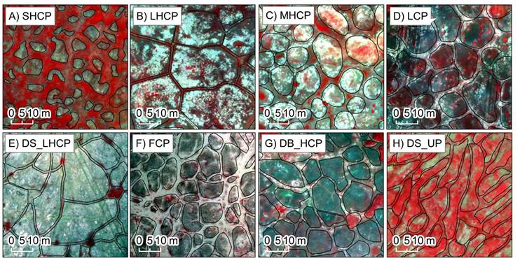 图4 五道梁地区无人机高分辨率标准加彩色影像中不同形态和类型的多边形土地貌特征