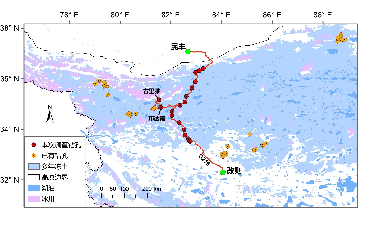 羌塘无人区是以高原脆弱生态环境为主要保护对象的保护区,属于我国四大无人区之一,也是多年冻土及其环境效应监测和研究的空白区。本次多年冻土科学考察共完成钻孔18个,累计钻探进尺达350多米,其中位于古里雅冰川区的钻孔深度达到了40m。研究人员获取了该区域的多年冻土和地下冰特征,采集了各类岩芯样本、冰/水样本等各类样本共计1200余件,完成探地雷达剖面10余公里,瞬变电磁测点近20余个,利用无人机、数码相机等获取各类地表影像资料20G以上。本次科考活动获取了大量区域多年冻土本底特征资料,初步构建了长度约600km、贯穿高原西部连续多年冻土区的综合观测网络,是继青藏公路(G109国道)之后又一条完整的南北向多年冻土观测断面。本次调查进一步拓展了青藏高原多年冻土监测网络,提升了对多年冻土发育规律的认知水平,为后续多年冻土对气候变化响应的对比研究提供了数据基础,可为区域气候与冰冻圈变化研究、生态环境保护、基础设施建设等多领域提供科学服务与数据支持。