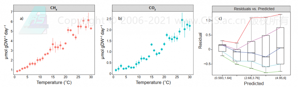 图3 温室气体CH4和CO2排放速率与升温正相关,但随温度升高排放速率的离差增大
