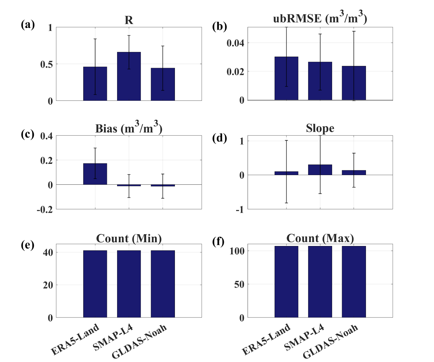图4 2016-2018年7-8月根系土壤水分产品验证指标中值及可用数据量。(a)-(d) 分别代表相关系数、无偏均方根误差、偏差和斜率的中值,误差棒代表各验证指标在16个站点的标准差。(e)-(f) 展示了每个产品用于验证的最低和最高的数据量。