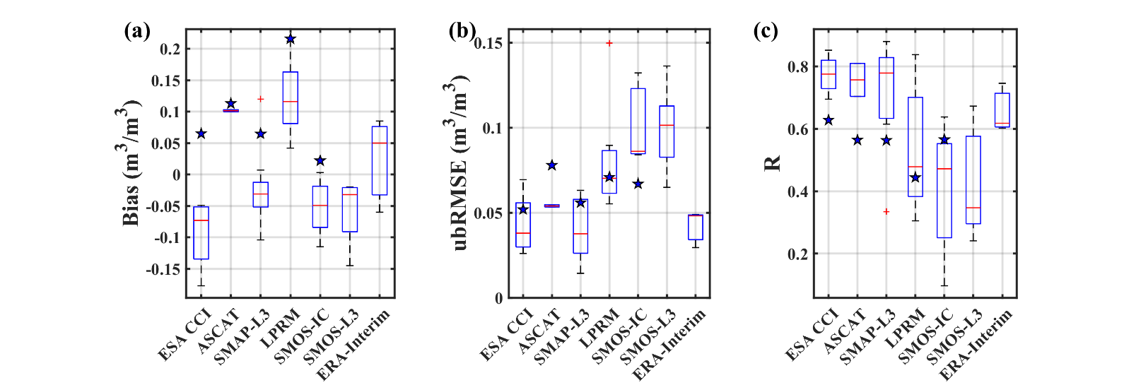 图6 本研究与以往季节冻土区近地表土壤水分产品验证精度对比总结(本研究验证指标用蓝色五角星表示)