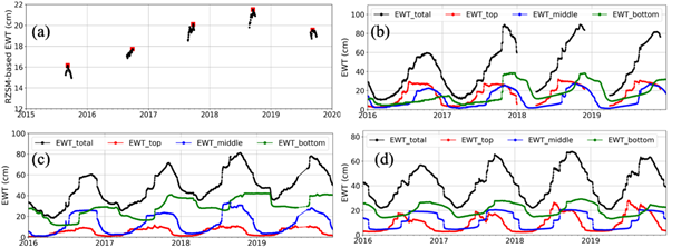 图3:(a)基于SMAP-L4根系土壤水分含量变化;(b),(c)和(d)为三个站点活动层土壤水分变化。