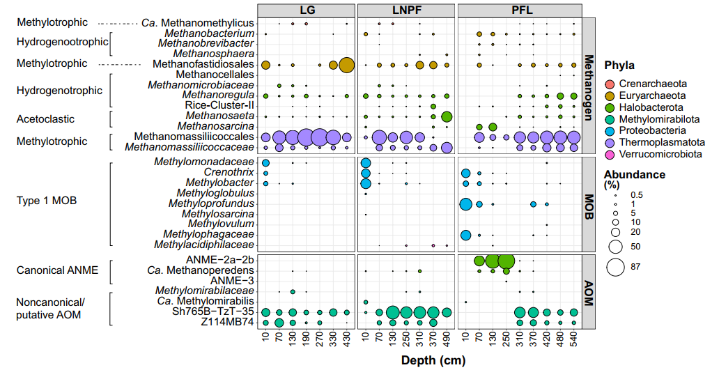图2,气泡图显示热融湖塘(LG 和LNPF)和泻湖(PFL)中产甲烷古菌(Methanogen),需氧甲烷氧化细菌(MOB)和厌氧甲烷氧化古菌(AOM)的组成特征。