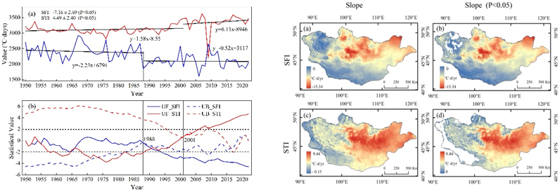 我站使用44个蒙古气象观测站点数据和SRTM DEM高程数据,对ERA5-Land Skin Temperature (ST)数据在蒙古的适用性进行了定量评估和校准(图1)。评估结果表明,ERA5-Land ST在蒙古整体表现出冷偏差,冷季表现更为明显。基于海拔差异进行校准后的数据在年尺度和季节尺度上均有显著改善,其中,RMSE的提升精度为92%和78%,MBE的提升精度为98%和82%。在此基础上,对蒙古1950-2022年的地表冻结指数(SFI)和地表融化指数(STI)的时空变化特征进行了分析(图2),结果显示SFI和STI分别呈现显著的下降趋势(7.16 oC·d/year)和上升趋势(4.49 oC·d/year),其中蒙古中部和东北部的变化幅度最为明显。