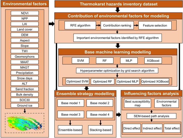 随着全球气候变暖,长江源区多年冻土的退化日益明显。由富冰多年冻土退化引发的热喀斯特灾害对基础设施建设和当地生态产生了重大影响,因此有必要对其风险进行评估。目前,多种热喀斯特灾害的高精度统一风险评估工具依然缺乏,且热喀斯特灾害的环境相互作用机制尚未完全明确。近日,我站研究人员提出了一种新型多热喀斯特灾害风险评估框架,将堆叠机器学习与潜在环境因子相结合,对长江源区的热喀斯特灾害进行风险评估,并通过模型优化提高了模型性能(图1)。