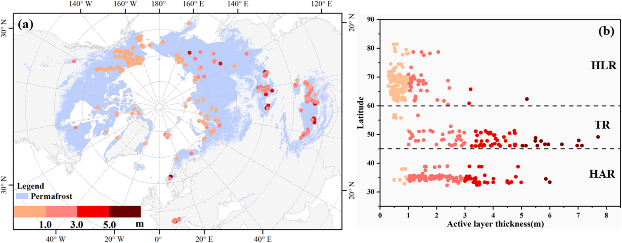图2 北半球多年冻土区活动层厚度空间分布特征(a),不同多年冻土区变化特征(b)