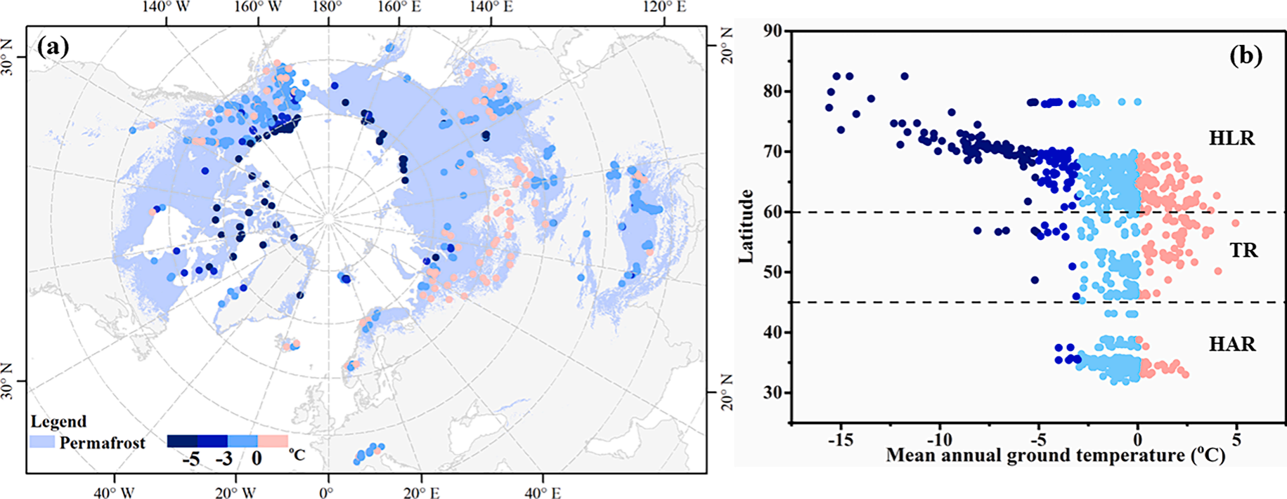 北半球多年冻土面积约占陆地面积的22 %;随着气候变化,全球范围内的多年冻土正经历不同程度的退化。位于环北极地区是高纬度多年冻土分布的主要区域,而青藏高原是中低纬度多年冻土分布面积最大的地区,北半球高纬度和高海拔多年冻土区对气候变化异常敏感,其增温速率明显高于其它地区。多年冻土的退化会对地下冰和有机碳的形成、存储环境,对多年冻土区地表的水、土、气、生等要素间的相互作用关系产生影响,进而影响所在区域的生态、水文过程和寒区工程基础设施。然而,以往的研究鲜有定量分析半球尺度多年冻土特征和退化过程区域差异的研究。