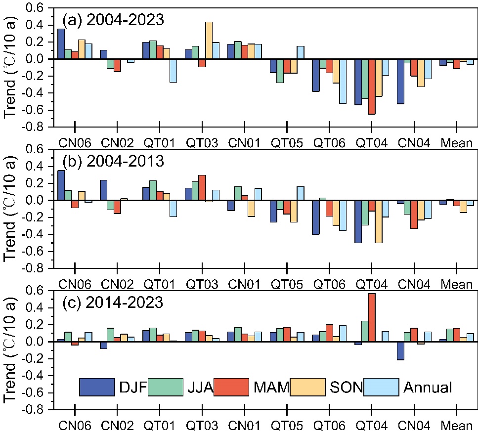 图2 2004 至 2023 年 研究站点 5 厘米年平均土壤温度和季节平均土壤温度的变化率