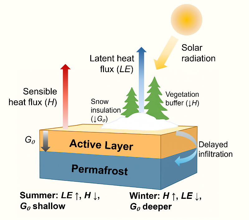 研究发现,多年冻土的“冻融记忆”(即冻结或融化状态在季节间延续并影响下一阶段热量与水分状况),连同土壤热物理特性及潜热/显热分配,决定了地表能量释放的节奏与路径,进而影响边界层稳定性、对流触发过程,并最终改变季风节律与大气遥相关结构。基于长期观测、遥感反演与过程模拟,团队首次完整描绘了从“地表能量分配 → 边界层演变 → 季风与行星波响应”的多尺度反馈链条,拓展了传统以碳循环作用为核心的研究视角。