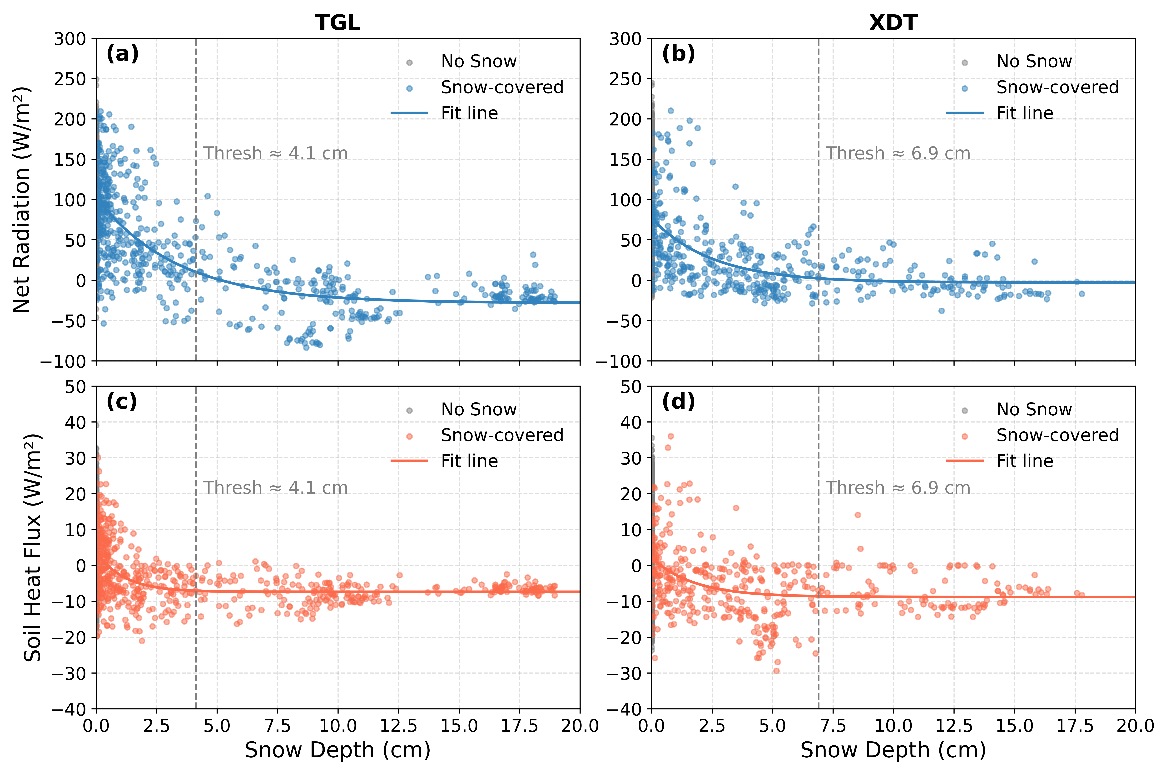 我站科研人员基于多年连续观测,系统揭示了积雪厚度对地表温度与能量通量的门槛效应。研究发现:当雪深超过4.1cm(唐古拉)和6.9cm(西大滩)时,积雪才会显著发挥保温作用;而在不足2cm的浅雪条件下,地表反因高反照率和融雪潜热消耗而出现冷却效应。