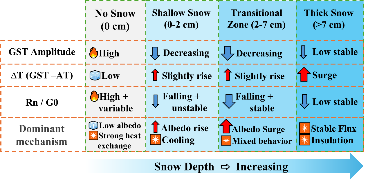 研究进一步表明,随着积雪增厚,地表净辐射和土壤热通量呈现非线性衰减并趋于稳定。据此,研究团队提出“四区间机制模型”,将雪–地相互作用划分为裸地、薄雪、过渡雪和厚雪四类典型状态,系统刻画了地–气耦合如何随雪深跨越由冷却到保温的转折点。