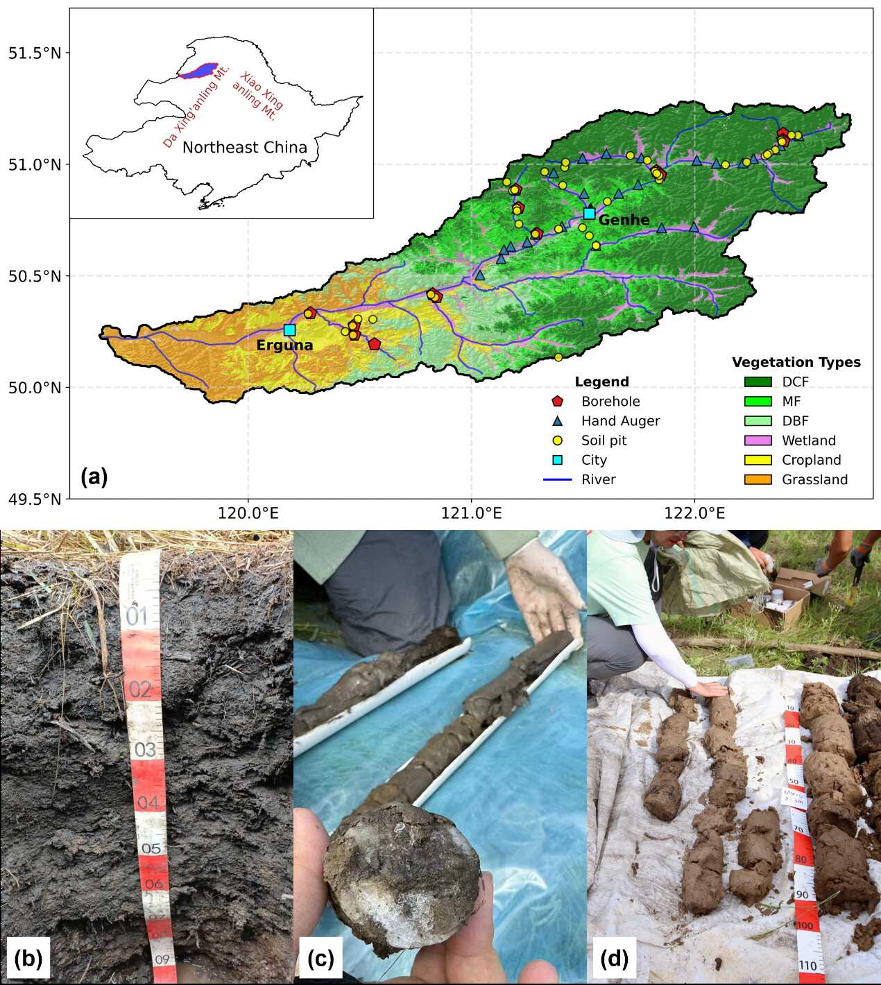 气候变暖背景下,北半球多年冻土正在加速退化,但边缘多年冻土区土壤水分在垂向上如何分层、由谁主导,一直缺乏实地约束,制约了对寒区水文过程和生态响应的认识。位于兴安–贝加尔多年冻土南缘的东北根河流域,植被类型与多年冻土分布格局高度交错,是典型的边缘多年冻土区景观组合,为识别这种“边缘带”中的水分–冻土耦合机制提供了难得窗口,因此被本研究选作典型研究区。