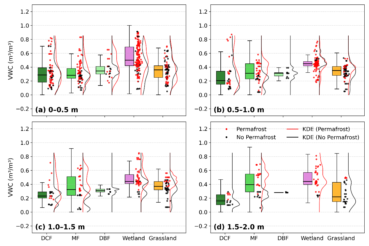 我站科研人员在我国东北大兴安岭根河流域布设了75个浅层剖面(0–3 m)和15个钻孔(最深达20 m),系统获取森林、草地和湿地不同下垫面的土壤体积含水量数据。研究发现,该区土壤水分呈现显著的垂向分层:0–0.5 m 主要受植被控制,湿地近地表长期保持高含水状态;活动层中部形成“植被–冻土耦合带”,植被根系与下伏冻土共同调节蓄水;在多年冻土上限附近(约1.5–2.0 m),含水量在多年冻土存在区明显抬升,反映出水分在冻土上方累积的“蓄水带”特征。总体上,多年冻土在各深度均增强了水分保留能力,而非冻土下的森林和草地剖面更易出现中层干化。