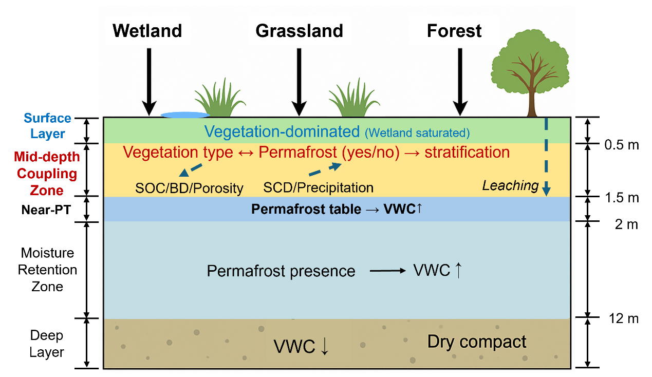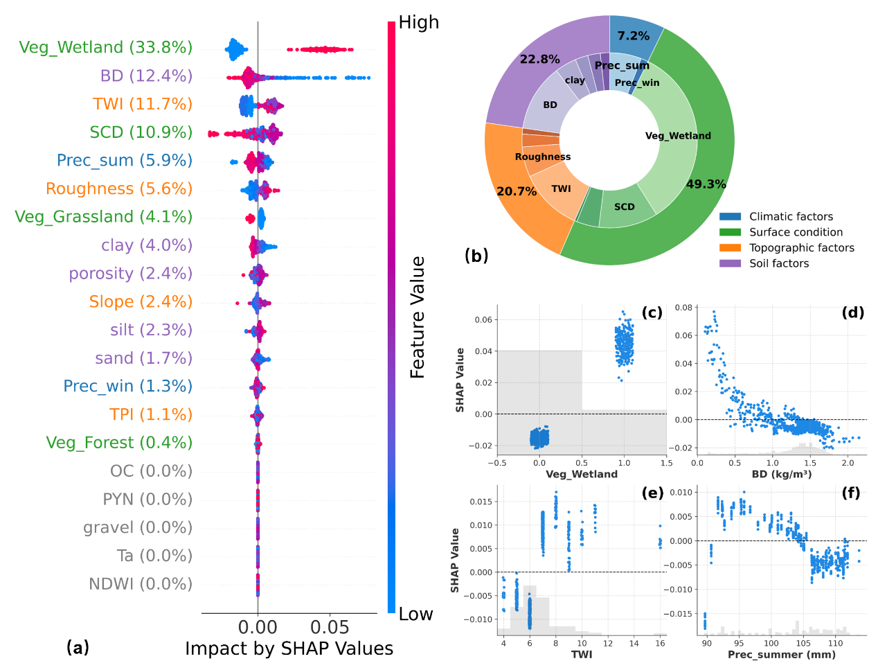 在机理分析方面,研究团队结合机器学习和结构方程模型表明:湿地覆盖、土壤有机碳等地表与土壤属性决定了浅层水分分布,土壤容重和多年冻土分布控制了深层蓄水,气候因子则主要通过改变保温和冻融过程间接影响水分结构。基于此,论文提出“垂向分层控制体系”的概念框架,突出植被与多年冻土在边缘多年冻土区共同塑造土壤水分垂向格局,对完善多年冻土水文过程认识和改进寒区陆面与水文模型具有重要参考价值。