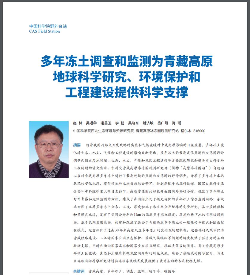 多年冻土调查和监测为青藏高原地球科学研究、环境保护和工程建设提供科学支撑[2017年10月发表于院刊]