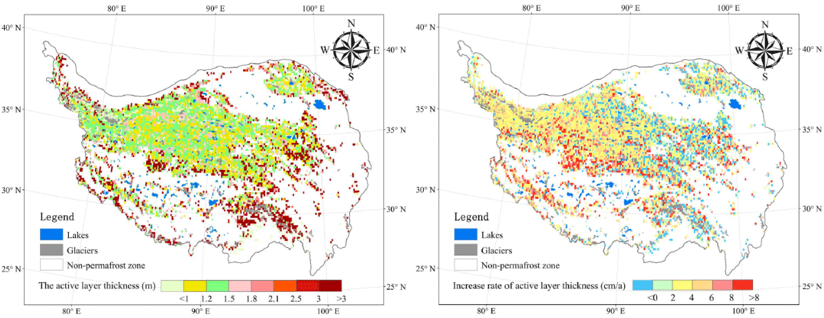 青藏高原多年冻土活动层厚度分布(左)及其变化趋势(右)