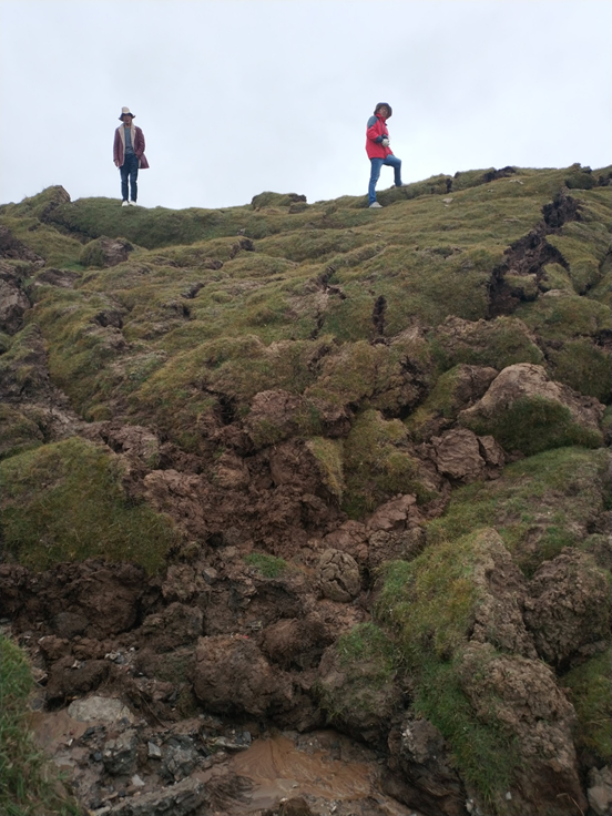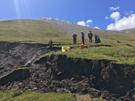 2017年9月1日凌晨,青海省兴海县温泉乡温泉村牧场发生热融滑塌事件,滑塌体长度70余米,面积约2000 m2,滑塌造成大面积的草场破坏,几乎阻断了通往温泉村的道路。正在附近进行科考工作的我站科考队立即赶赴滑塌现场开展科学考察,科研人员利用无人机、探地雷达、土壤探坑等技术手段对滑塌现场进行了考察和评估,布设了固定剖面进行监测,并现场向当地牧民解释造成滑坡的原因。