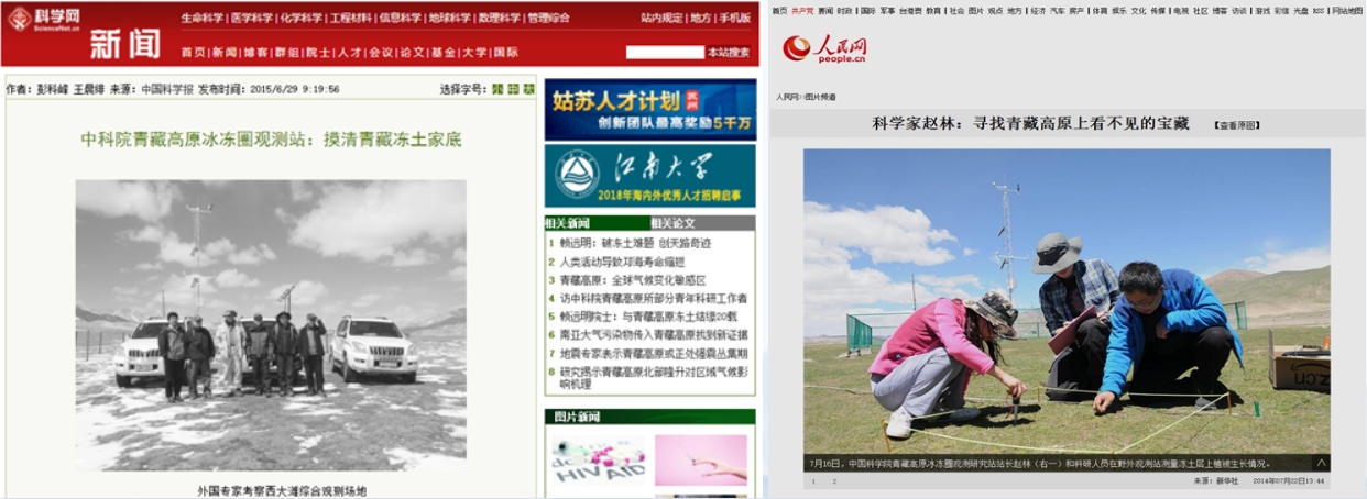 中央电视台《地理中国》栏目组、新华网、人民网、人民日报、中国科技网、科技日报等媒体报道本站各项科研工作,提升公众对多年冻土的理解。