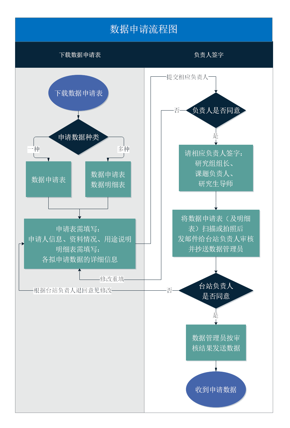 6. 申请人提交申请表(及明细表)至台站负责人审核并抄送数据管理员,台站负责人批准后,由数据管理员存档并发放数据。