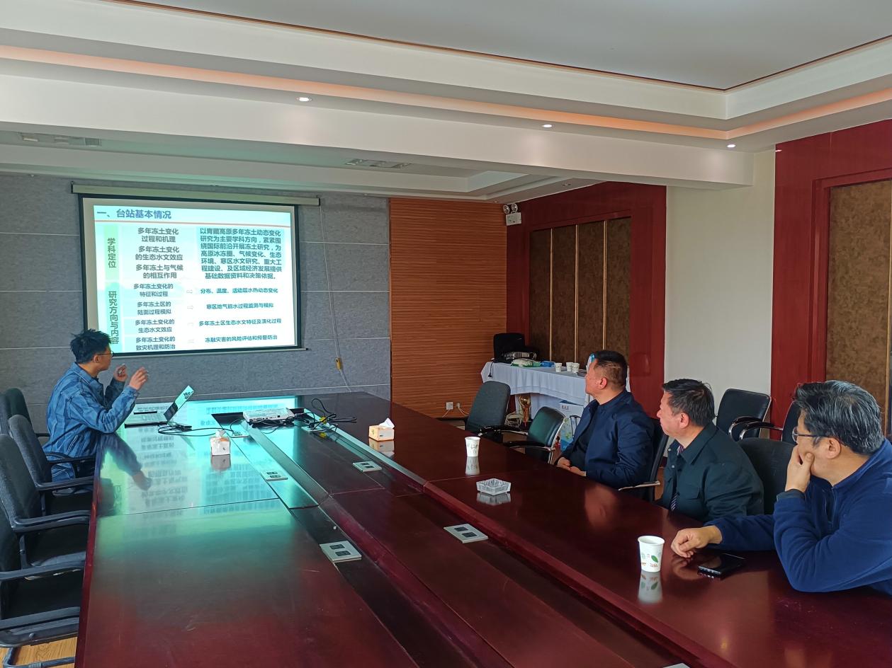 来访领导首先参观了我站的实验室、样品储藏室和园区基础设施。随后,朱小凡副研究员围绕我站的建站历史、野外观测站点、观测项目、近年科研进展等方面对来访领导做了详细汇报。杨广智副主任和付洋副局长对我站在多年冻土野外观测和科学研究方面取得的成果给予了高度评价,希望我站未来充分发挥自身优势,与青海省青藏科学考察服务中心、格尔木市相关部门在项目共建、资源共享和技术合作等方面开展深度合作,共同推动青海省格尔木市科技领域的高质量发展,为当地资源环境可持续发展注入新动能。