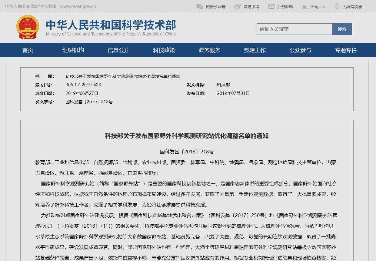 我站以优秀成绩进入科技部国家野外科学观测研究站优化调整名单