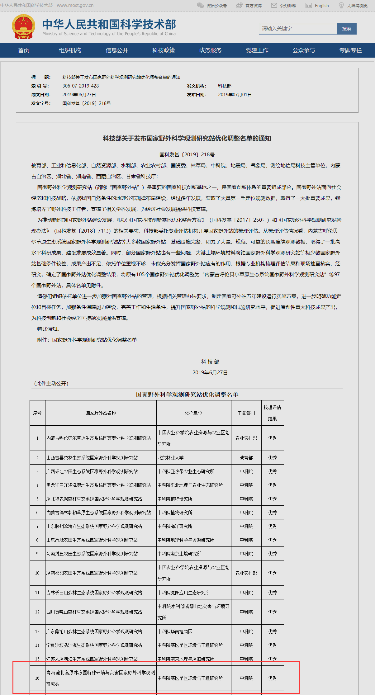 我站以优秀成绩进入科技部国家野外科学观测研究站优化调整名单