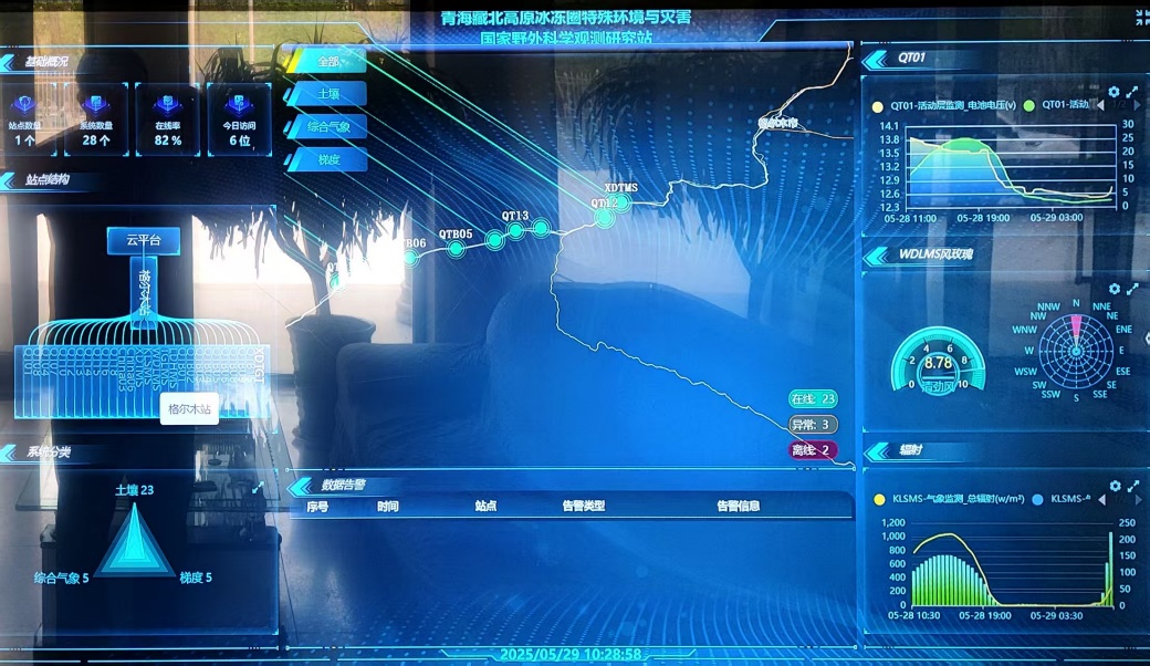 科研数据是揭示自然规律、支撑科学决策和推动技术创新的基础核心。5月29日,由中国科学院西北生态环境资源研究院青海藏北高原冰冻圈特殊环境与灾害国家野外科学观测研究站(以下简称格尔木站)牵头,并联合北京华益瑞科技有限公司合作建设的“格尔木站站网数据实时传输监控系统”正式上线运行,标志着我国在青藏高原冰冻圈环境与灾害监测领域迈出了数字化、智能化的重要一步。