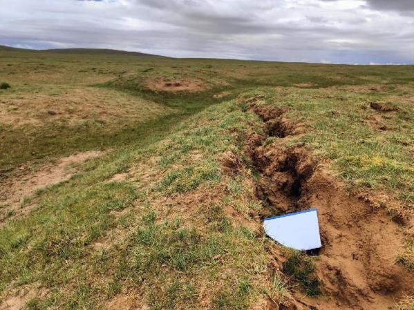 图1 冻胀裂缝(热融侵蚀沟地区非常发育,冻胀裂缝最大宽度约达55cm,深度最大约达70cm