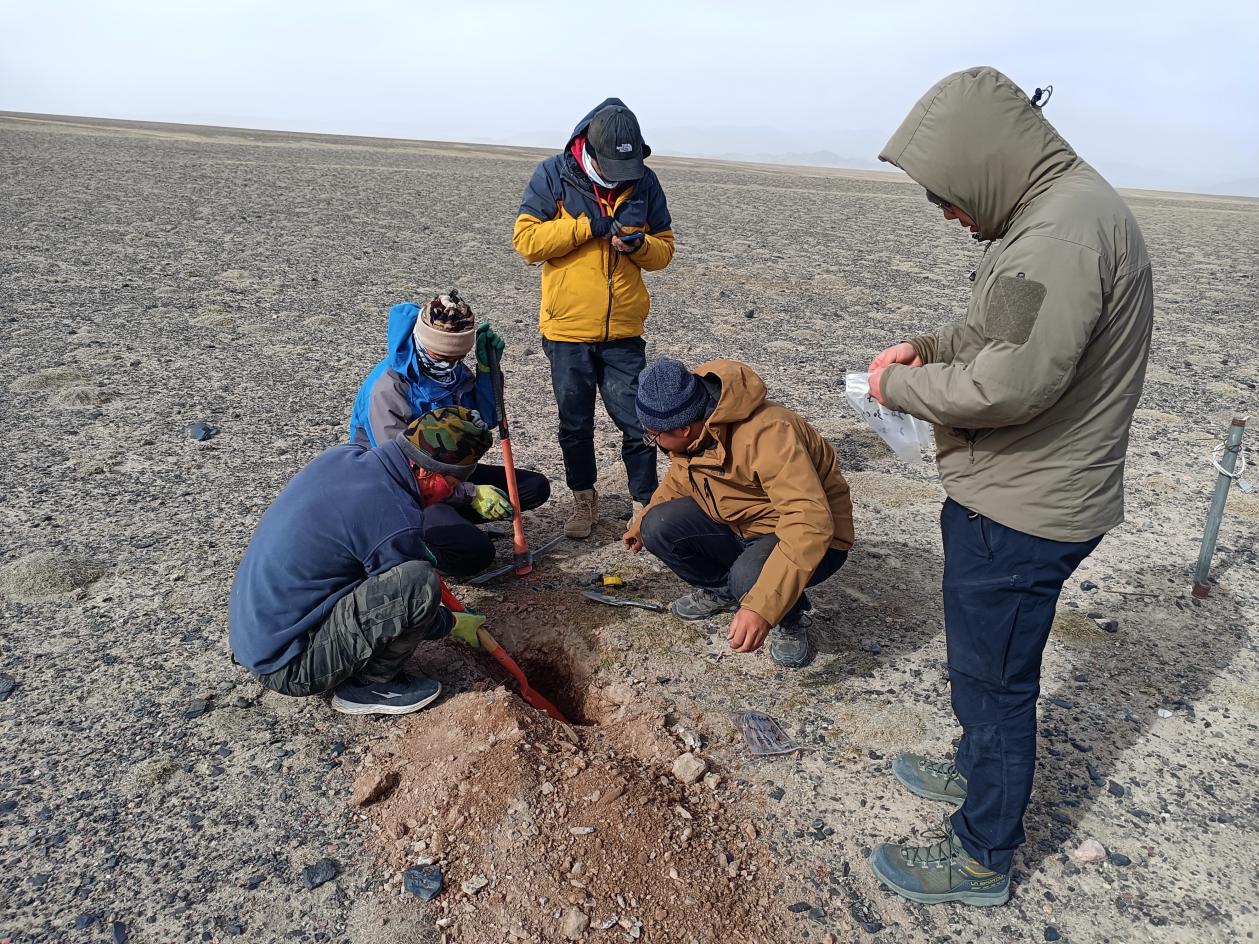 2025年5月10日至5月14日,我站乔永平副站长、朱小凡副研究员、刘广岳工程师、研究生宫鹏、唐问悉和赵晋彪等十余人,在青藏高原阿尔金地区开展了多年冻土调查和仪器维护工作,具体包括:(1)收集地面气象和活动层水热监测系统数据;(2)采集12个冻土地温钻孔数据,并维护相关观测仪器;(3)布设HOBO近地表温度监测探头和安装地面形变仪器一套;(4)针对典型地面形变和多边形区域开展了无人机调查;(5)针对典型冻土地貌开展电磁法地球物理调查;(6)采集阿雅克库木湖南、北两岸水样和典型区域的土壤样品等。此外,我站还配合中国科学院空天信息创新研究院方广有研究员团队完成了类火星冻土地貌区域探地雷达数据采集以及火星车载荷实验。