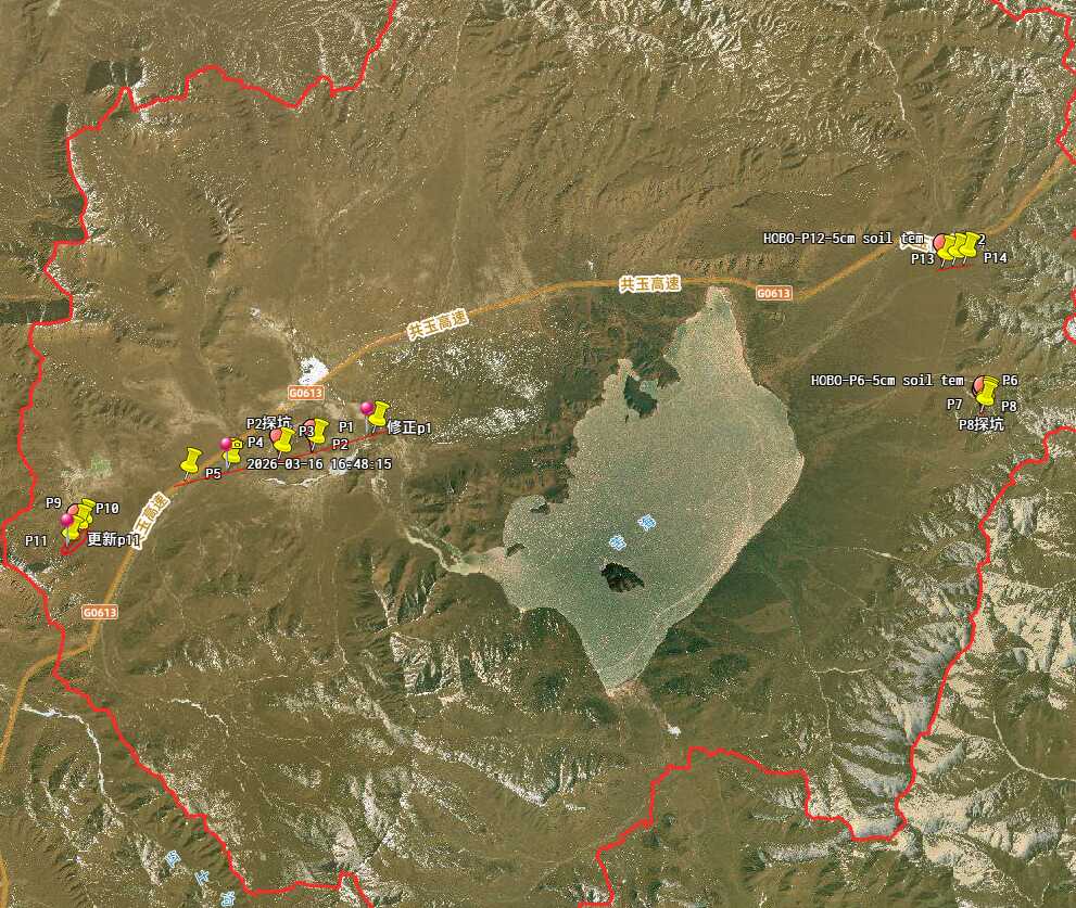 2026年3月14日至17日,我站科研人员在青藏高原黄河源地区兴海县温泉乡和玛多县花石峡镇开展了多年冻土地温监测和仪器维护工作。黄河源地区平均海拔4300 m以上,多年冻土广泛发育,冻融过程对该区水资源、生态系统及各类工程设施的安全运行具有重要影响。此次野外工作内容包括:(1)收集5个钻孔布设的地下180cm至地表的梯度地温监测温度链数据;(2)收集四个监测剖面共11个地表温度监测探头设备数据;(3)对损毁及失效的监测设备进行更换;(4)采集部分剖面及热融滑塌区域的无人机影像数据。