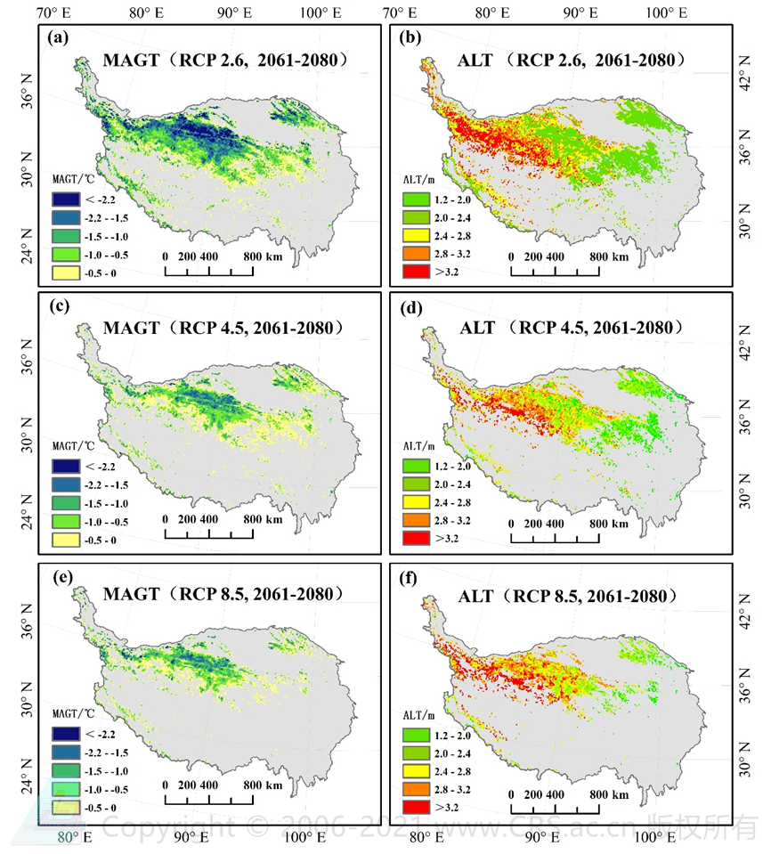 图3 预估不同RCPs(2.6、4.5和8.5)下青藏高原多年冻土区年平均地温和活动层厚度的空间变化格局
