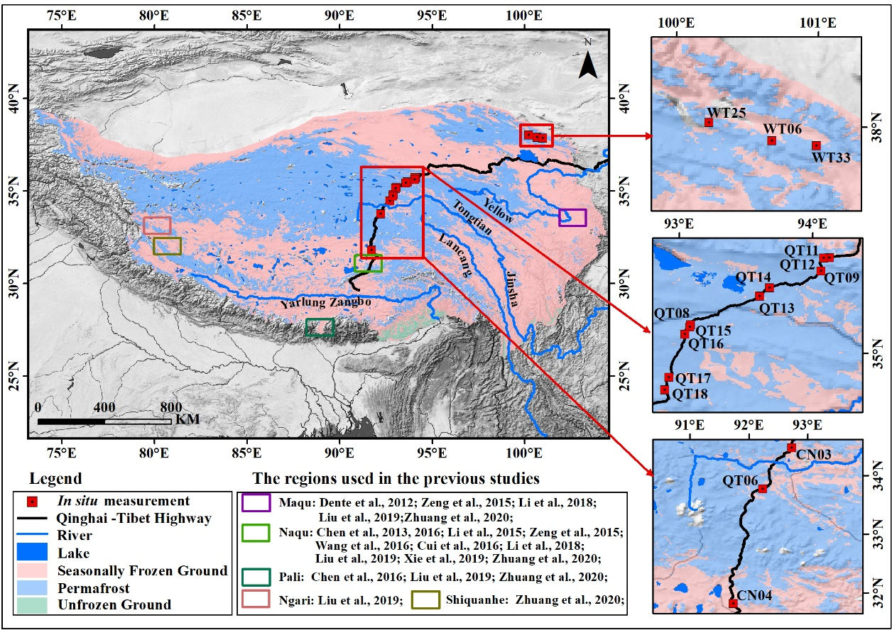 青藏高原广泛分布的多年冻土通过其独特的下垫面水热交换特征影响着区域水文和水循环过程。土壤水分是理解多年冻土区陆-气间能水交换过程的关键参数之一,是影响多年冻土状态、气候变化响应及区域生态特征的重要因子。青藏高原季节冻土区的土壤水分验证工作已开展近十年,但是多年冻土区的土壤水分产品验证工作相对较少。因此,准确评估多年冻土区土壤水分产品精度对青藏高原冰冻圈水文水循环过程研究具有重要的意义。