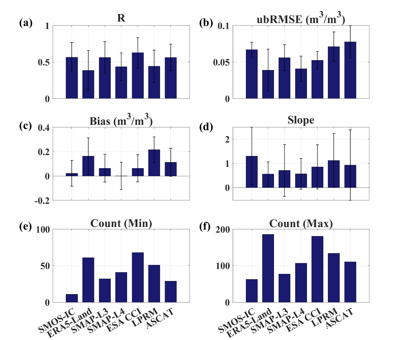 图2 2016-2018年7-8月近地表土壤水分产品验证指标中值及可用数据量。(a)-(d) 分别代表相关系数、无偏均方根误差、偏差和斜率的中值,误差棒代表各验证指标在16个站点的标准差。(e)-(f) 展示了每个产品用于验证的最低和最高的数据量。