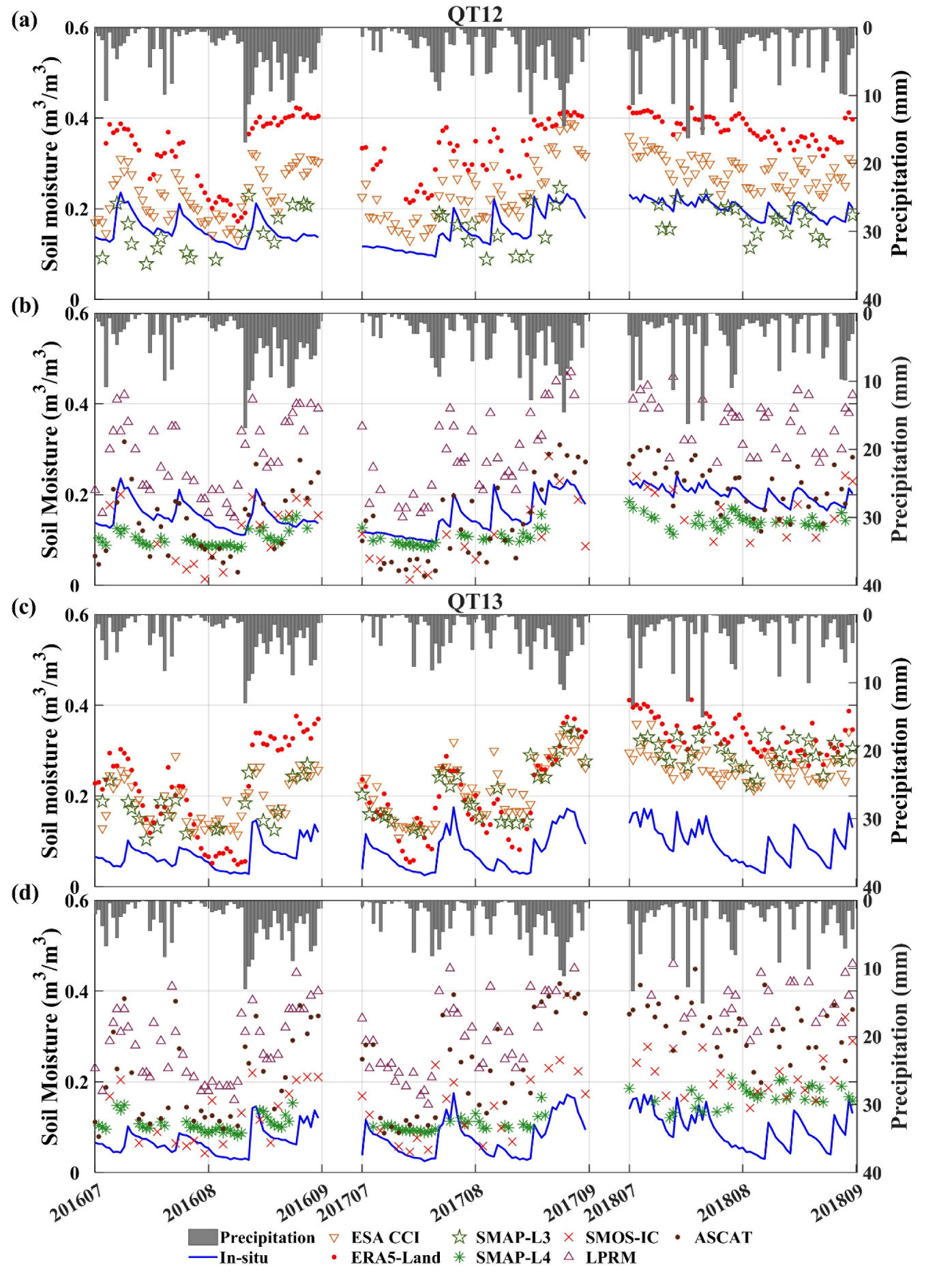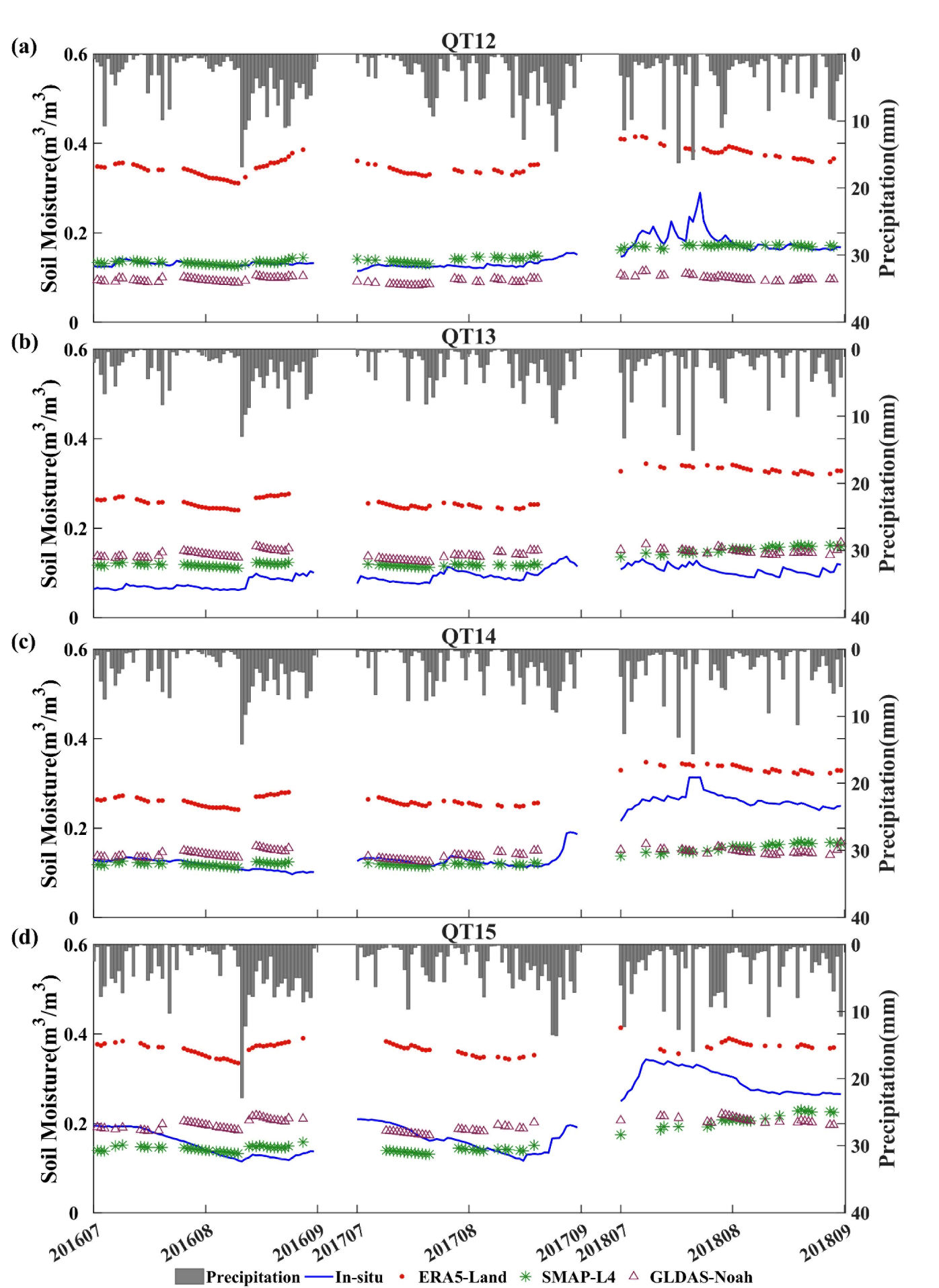 图5 2016-2018年7-8月QT12、QT13、QT14和QT15站点的地面观测与根系土壤水分产品时间序列,日降水量用灰色条形图表示