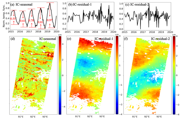 该成果以Increased Water Content in the Active Layer Revealed by Regional-Scale InSAR and Independent Component Analysis on the Central Qinghai-Tibet Plateau为题发表于地学一区TOP期刊Geophysical Research Letters。我站吴通华研究员为论文通讯作者,陈杰博士为论文第一作者。该研究得到了国家自然科学基金青年基金(42001072)、中国博士后科学基金特别资助(站中)项目(2021T140702)和中国科学院“特别研究助理资助项目”(陈杰)等共同资助。