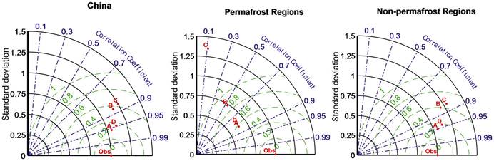 我站温阿敏博士生结合全国台站地面观测数据,对比了MREEA-2、MERRA、JRA-55、ERA-Interim四套地表温度产品精度,得出MERRA2地表温度更接近站点实测值,尤其是在我国多年冻土区(图1)。但仍存在一定的冷偏差,尤其是2005年之后,冷偏差呈增大趋势。为减少再分析数据冷偏差造成多年冻土分布模拟的不确定性,提出了两种偏差校正方法,分别考虑了高程差及植被,并综合季节变化对地表温度的影响。统计结果表明,基于高程差—地表温度偏差的线性回归方法,可更有效地消除MERRA2地表温度与实测数据的偏差。与前人重建后的MODIS地表温度产品相比,校正后的MERRA-2地表温度数据更接近站点实测值。而考虑植被影响的方法有效消除了时间序列趋势上偏差增大的问题。尝试将两种方法系统地结合,进而消除再分析地表温度在时空尺度上的偏差,提高数据精度和适用性具有重要的现实意义。