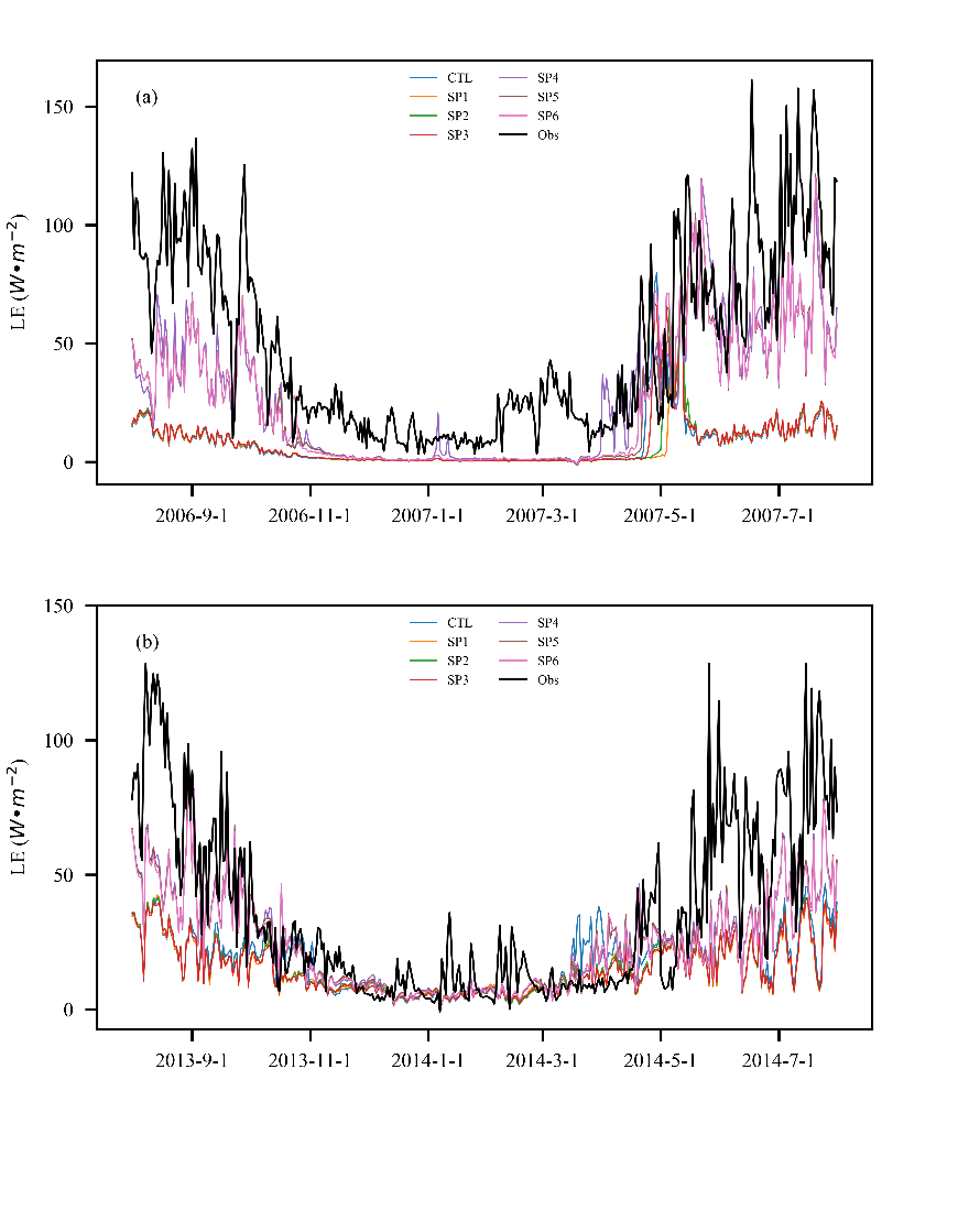 我站马俊杰博士生结合青藏高原多年冻土区4个观测站点数据(图1),评估了CLM5.0模式在青藏高原多年冻土区地表能量收支及土壤水热的模拟性能,并设计了6组试验(表1),综合对比了不同热力学粗糙度参数化方案和土壤阻抗方案的模拟效果。研究结果显示,CLM5.0模型能够较好地模拟土壤温度的季节变化特征,且浅层土壤模拟结果优于深层。模型能够捕获土壤水分的变化,但是模拟效果不如土壤温度,且存在一定程度的高估。相比之下,地表能量收支过程更为复杂。因此,地表能量通量的模拟效果最差,感热通量存在明显的高估,潜热通量则有着明显的低估。组合了土壤属性修改、热力学粗糙度和土壤阻抗参数化方案后,显著提高了CLM5.0模型地表能量通量的模拟结果。改进后的模型有效改善了感热通量的高估(图2)及潜热通量的低估(图3),与实测值更为接近。同时,最优的组合方案也在土壤温度和土壤水分的模拟展现了优势,显著提升了土壤温度的模拟效果,对唐古拉站点四层土壤温度RMSE分别从1.95 °C, 2.07 °C, 2.02 °C, 和 2.95 °C提高到了 1.34 °C, 1.35 °C, 1.35 °C, 和 2.29 °C;也提高了表层土壤水分的模拟性能,西大滩站点表层土壤水分RMSE从0.136 m3 m-3 提高到0.049 m3 m-3。