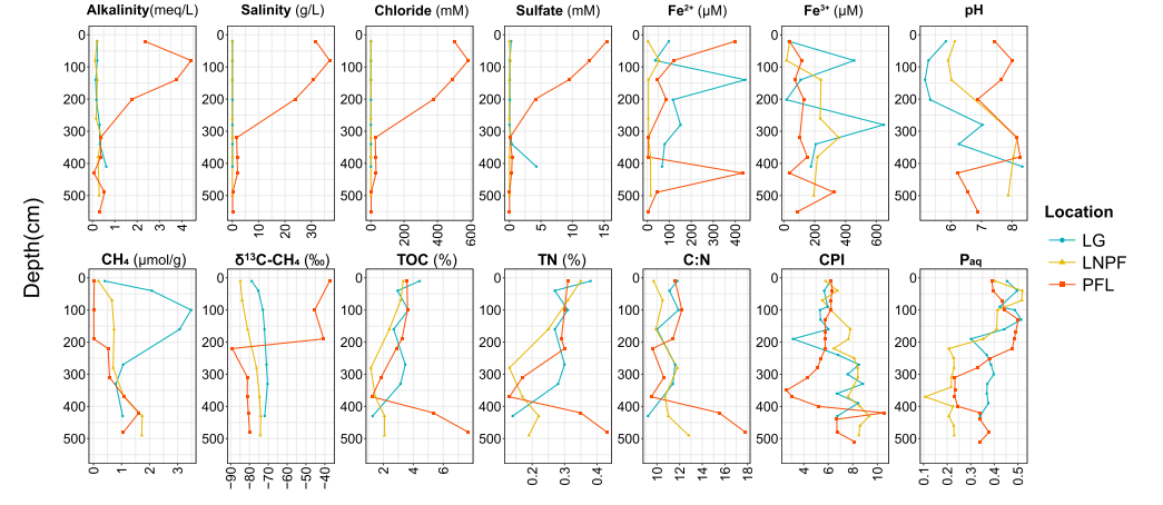 图1,海岸冻土带三个热融湖塘湖相沉积层的孔隙水化学特征。 纵轴表示从沉积层表面开始的深度。 其中LG和LNPF为淡水环境的热融湖塘,PFL为热融泻湖。其沉积层表层分别位于湖面以下 510、560 和 310cm处。