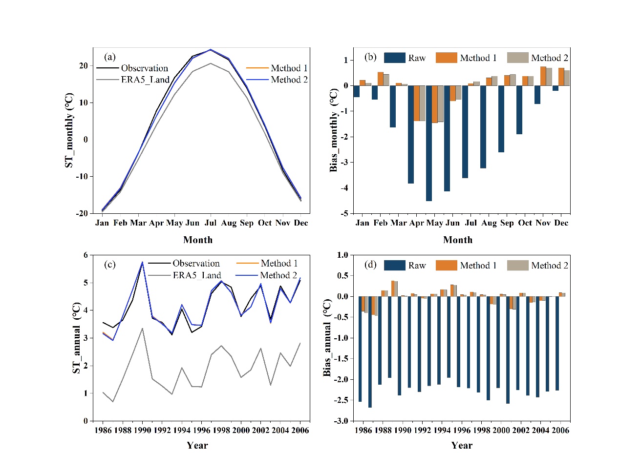 我站使用44个蒙古气象观测站点数据和SRTM DEM高程数据,对ERA5-Land Skin Temperature (ST)数据在蒙古的适用性进行了定量评估和校准(图1)。评估结果表明,ERA5-Land ST在蒙古整体表现出冷偏差,冷季表现更为明显。基于海拔差异进行校准后的数据在年尺度和季节尺度上均有显著改善,其中,RMSE的提升精度为92%和78%,MBE的提升精度为98%和82%。在此基础上,对蒙古1950-2022年的地表冻结指数(SFI)和地表融化指数(STI)的时空变化特征进行了分析(图2),结果显示SFI和STI分别呈现显著的下降趋势(7.16 oC·d/year)和上升趋势(4.49 oC·d/year),其中蒙古中部和东北部的变化幅度最为明显。