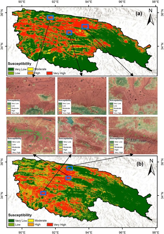 随着全球气候变暖,长江源区多年冻土的退化日益明显。由富冰多年冻土退化引发的热喀斯特灾害对基础设施建设和当地生态产生了重大影响,因此有必要对其风险进行评估。目前,多种热喀斯特灾害的高精度统一风险评估工具依然缺乏,且热喀斯特灾害的环境相互作用机制尚未完全明确。近日,我站研究人员提出了一种新型多热喀斯特灾害风险评估框架,将堆叠机器学习与潜在环境因子相结合,对长江源区的热喀斯特灾害进行风险评估,并通过模型优化提高了模型性能(图1)。