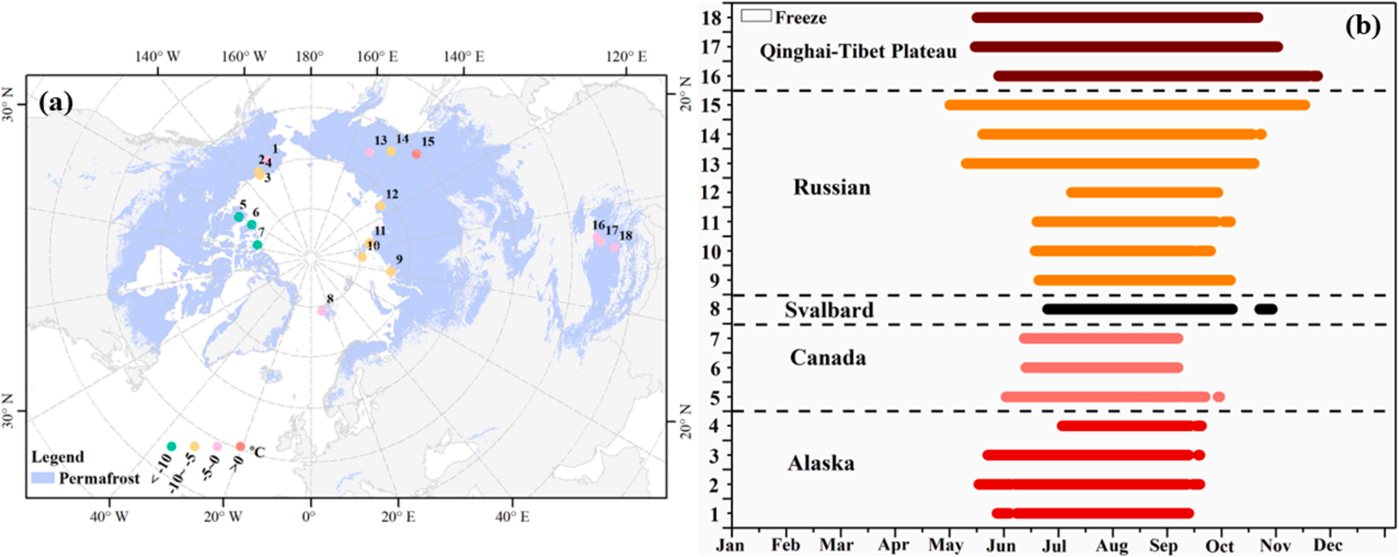 北半球多年冻土面积约占陆地面积的22 %;随着气候变化,全球范围内的多年冻土正经历不同程度的退化。位于环北极地区是高纬度多年冻土分布的主要区域,而青藏高原是中低纬度多年冻土分布面积最大的地区,北半球高纬度和高海拔多年冻土区对气候变化异常敏感,其增温速率明显高于其它地区。多年冻土的退化会对地下冰和有机碳的形成、存储环境,对多年冻土区地表的水、土、气、生等要素间的相互作用关系产生影响,进而影响所在区域的生态、水文过程和寒区工程基础设施。然而,以往的研究鲜有定量分析半球尺度多年冻土特征和退化过程区域差异的研究。