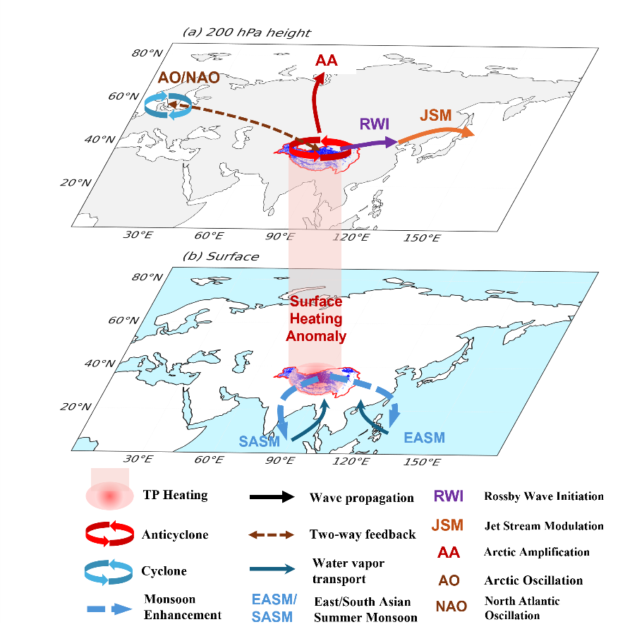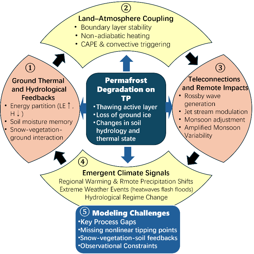 研究发现,多年冻土的“冻融记忆”(即冻结或融化状态在季节间延续并影响下一阶段热量与水分状况),连同土壤热物理特性及潜热/显热分配,决定了地表能量释放的节奏与路径,进而影响边界层稳定性、对流触发过程,并最终改变季风节律与大气遥相关结构。基于长期观测、遥感反演与过程模拟,团队首次完整描绘了从“地表能量分配 → 边界层演变 → 季风与行星波响应”的多尺度反馈链条,拓展了传统以碳循环作用为核心的研究视角。