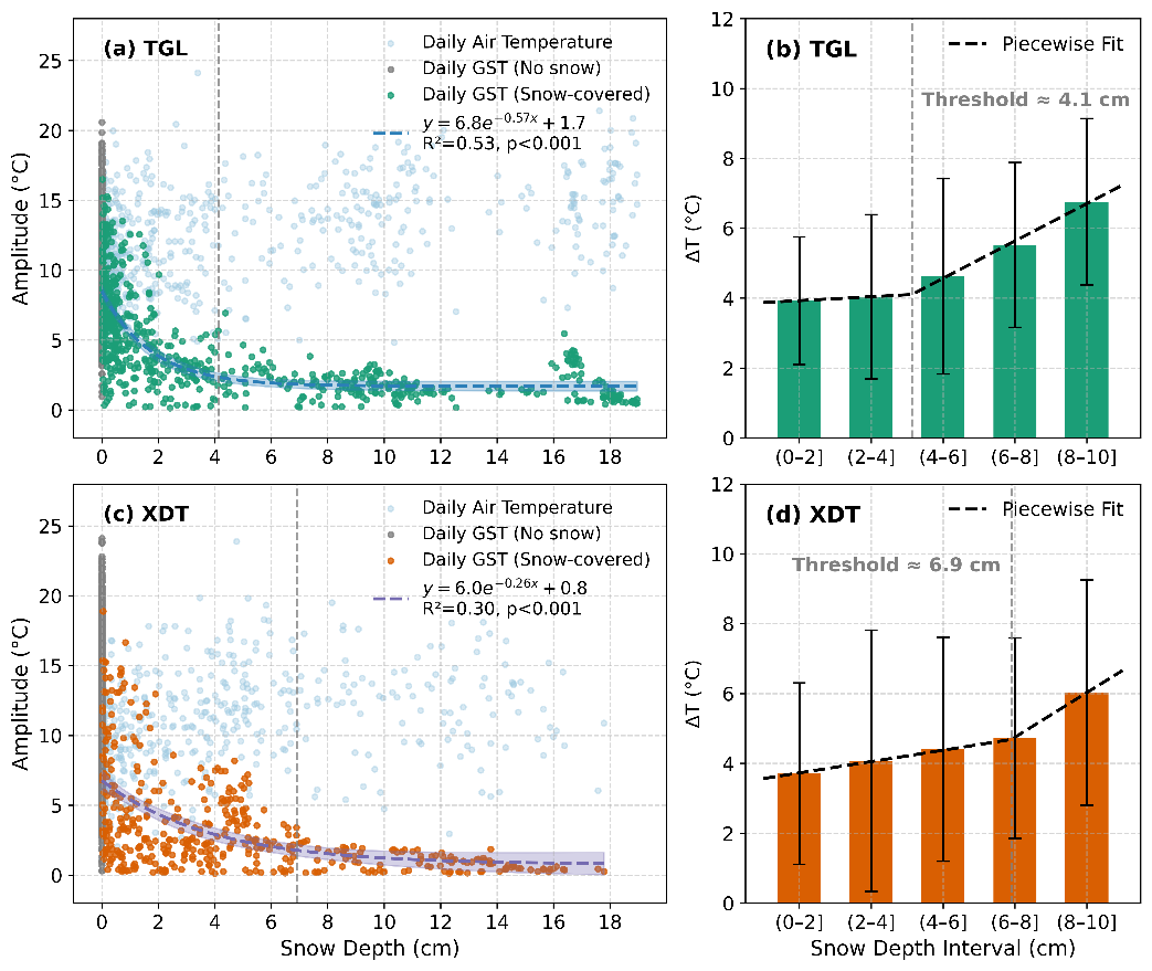 该研究成果以 “Threshold-governed insulating and cooling effects of snow cover on alpine permafrost: evidence from the Qinghai–Tibet Plateau” 为题,发表在地学一区TOP期刊 Agricultural and Forest Meteorology 上。我站肖瑶助理研究员为论文第一作者,胡国杰研究员与南京信息工程大学赵林教授为共同通讯作者。