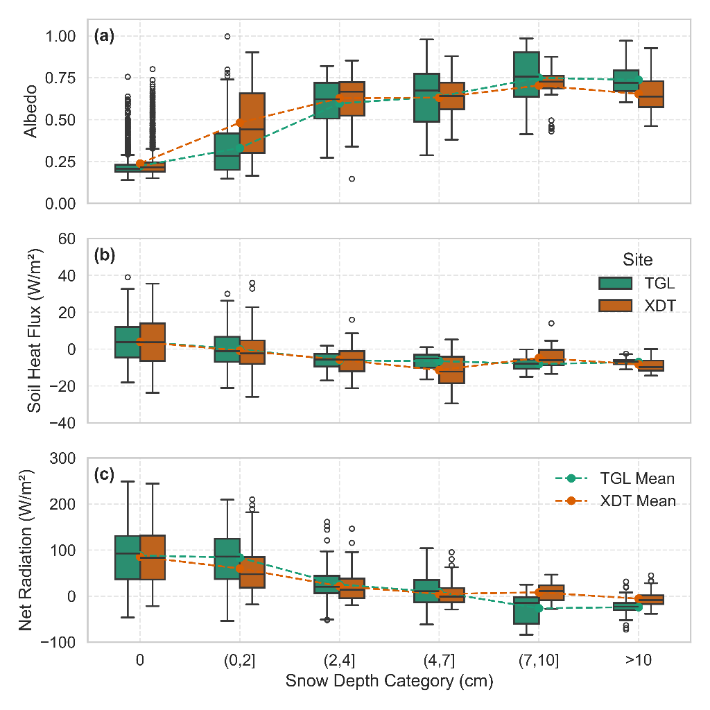 不同雪深条件下反照率、净辐射和土壤热通量变化