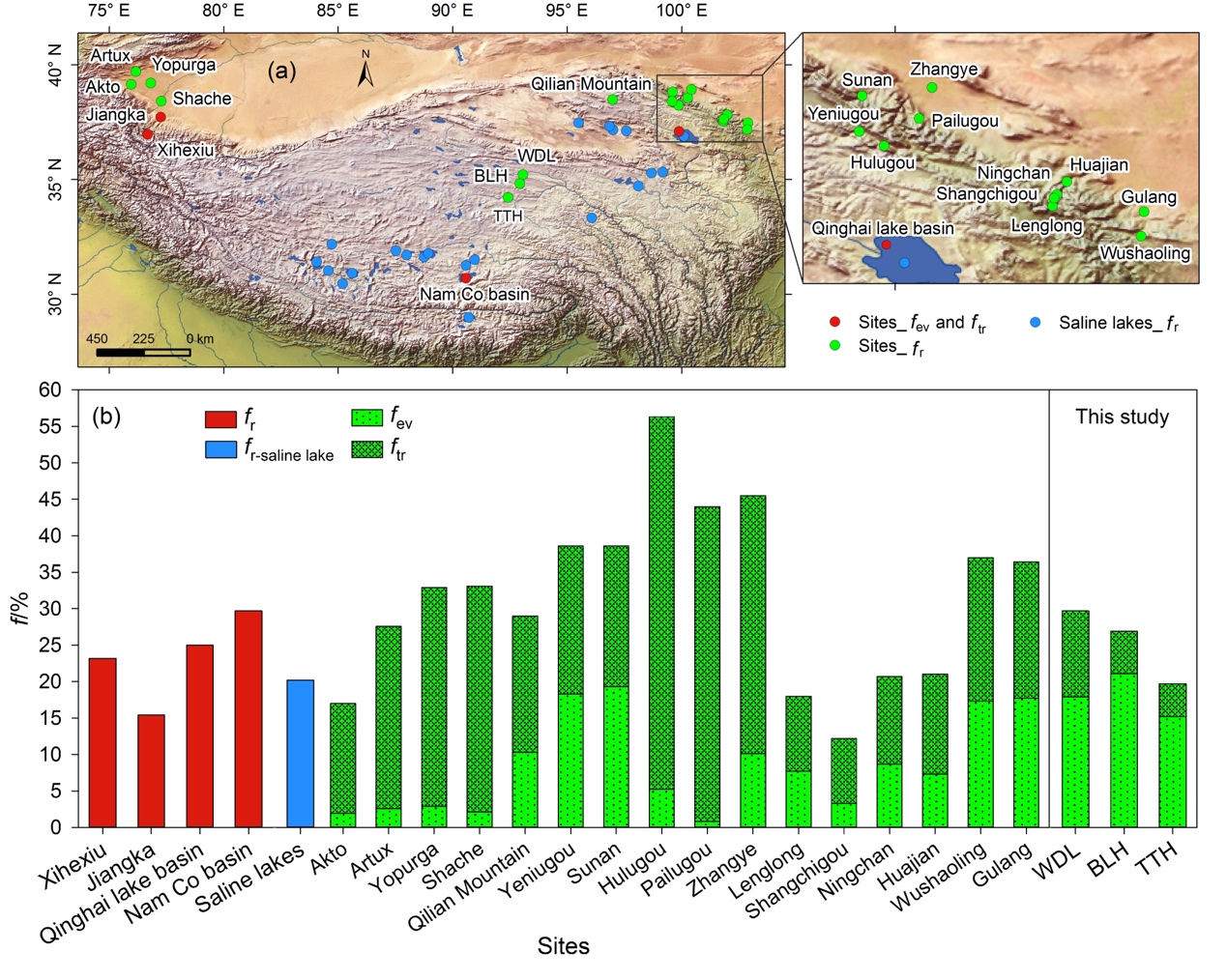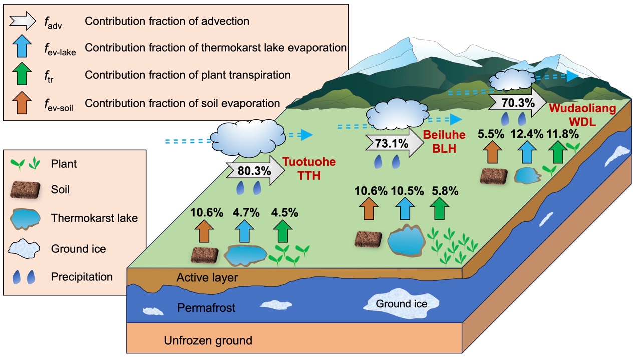 该成果以“Evaporation From Soil and Thermokarst Lakes Contribute More to Local Precipitation Than Plant Transpiration in Permafrost Regions of the Central Qinghai—Tibet Plateau”为题发表在地球科学Top期刊Water Resources Research,并获国家重点研发计划项目、中国科学院“西部之光”重点实验室交叉团队项目和国家自然科学基金等项目的资助。